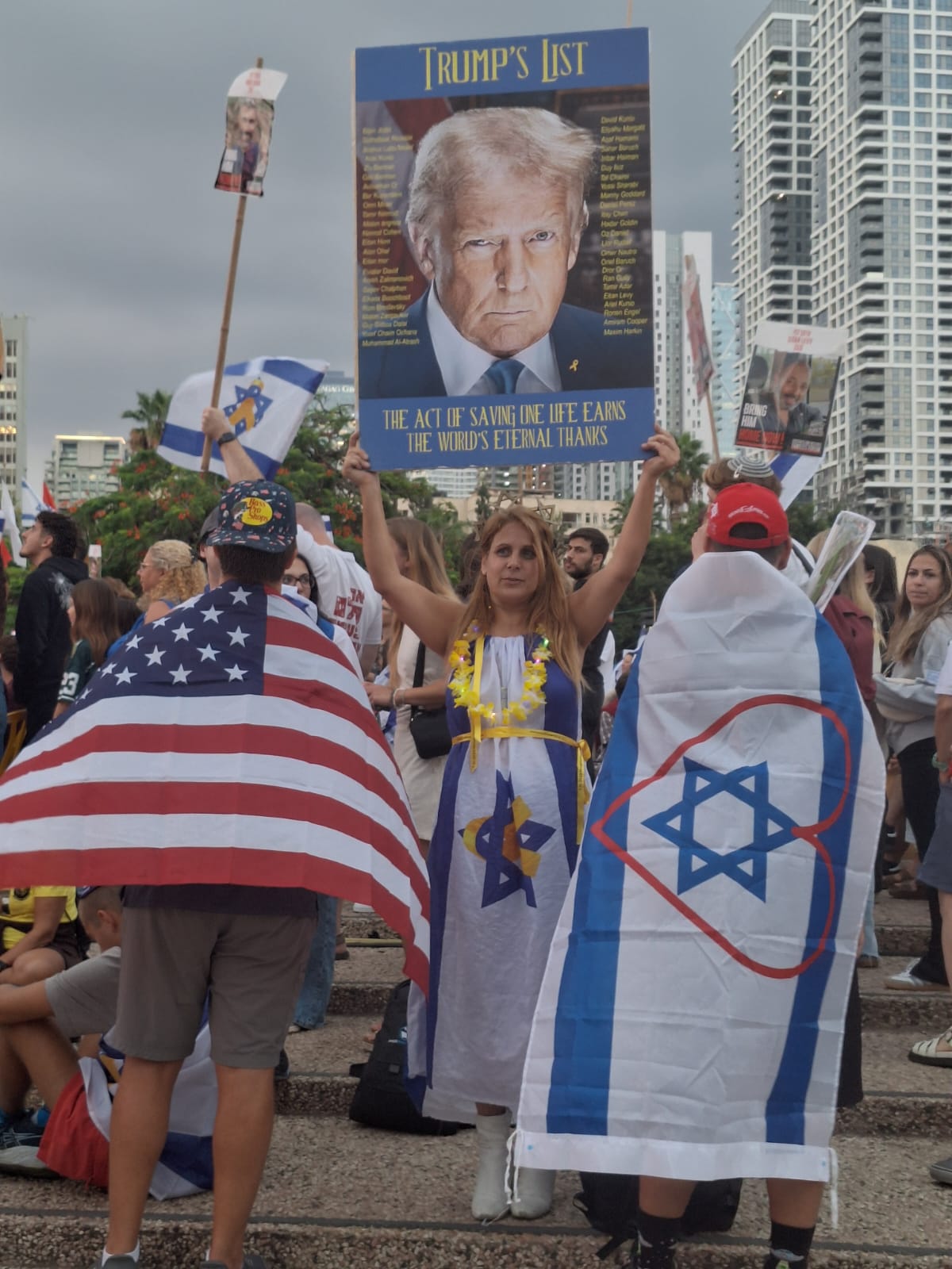 Meanwhile, on the Tel Aviv beachfront, spontaneous celebrations erupted. “Someone started screaming, ‘Oh my G-d, look at the plane!’” Tradonsky said. “As we looked up, we realised it was Trump’s plane flying over the beachfront. The whole beach was covered in Israeli flags, and across the sand, they had written ‘Thank you’ in huge letters made from sheets of fabric.”