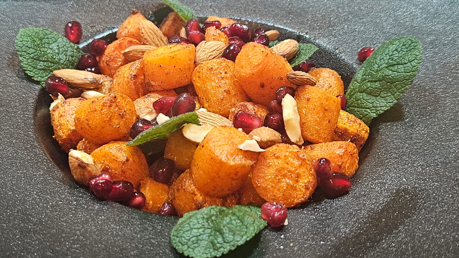 Toss together all the ingredients except the orange juice, lemon juice, pomegranate seeds, and nuts. Cook at 180C until the carrots are al dente – about 15 minutes – then return them to the bowl with the juices. Toss and garnish with the pomegranate seeds, nuts, and sprigs of mint.