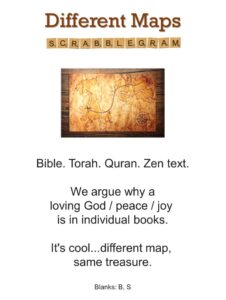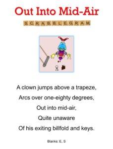 His ideas come from everywhere. “When I first started making Scrabblegrams, I enjoyed choosing topics that were ‘favourites’ for me over the years – favourite books, movies, tv shows, games, or artists,” he said. “After that, I expanded the themes to anything else that seemed interesting and inspired genuine enthusiasm, like historic events, science themes, stories from mythology, and much more, including the challenge of additional constraints [such as Scrabblegram haiku, visual constraints like shaping the letters into a diamond or an hourglass, and others]. Following that, I had a period where I began creating entries that were themselves prose or poetry, or about more abstract or philosophical topics – while continuing to make fun and silly ones too.”