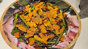 Layer a large platter with the rocket and watercress, add the cooled green beans, peeled and quartered beetroot, and roasted butternut. Sprinkle on the pomegranate seeds and toasted sesame.