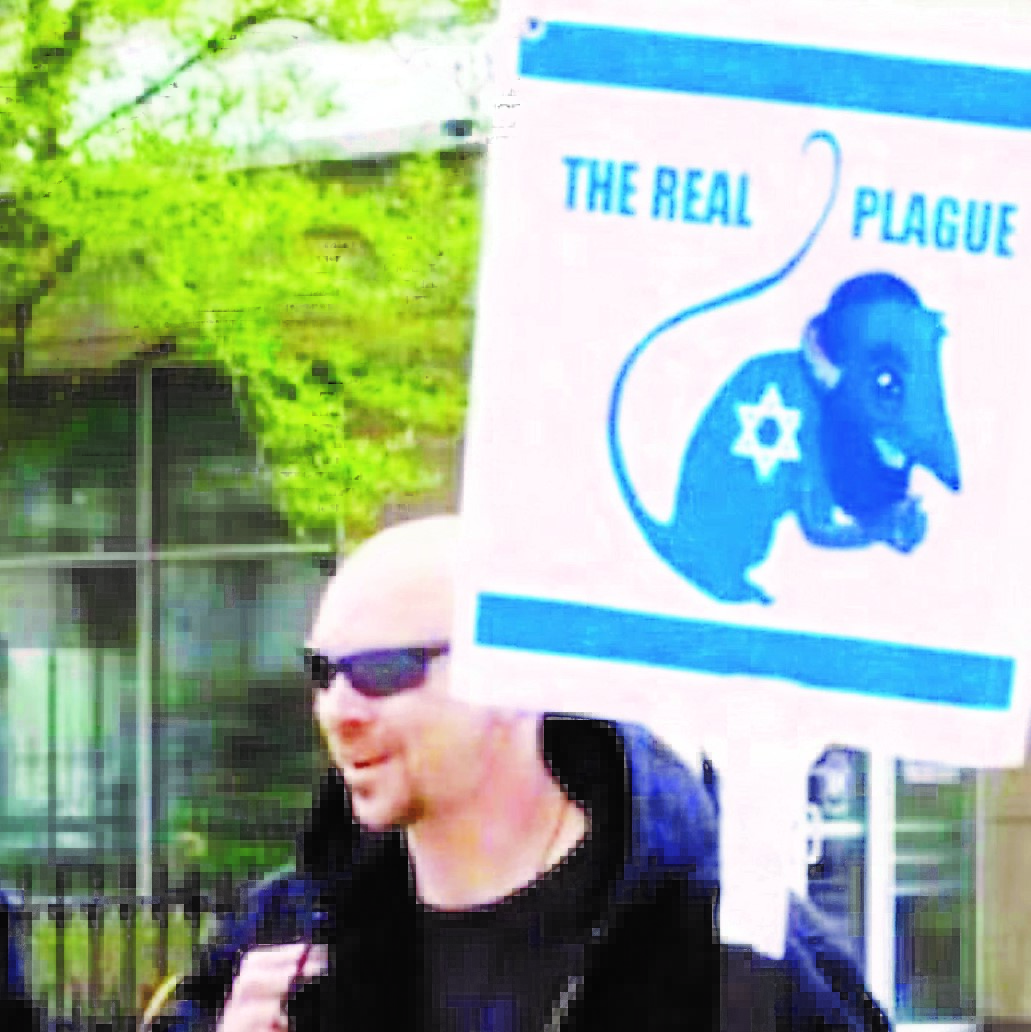 It shows a picture of a man in the US protesting at a rally with a sign saying “the real plague” in the colours of the Israeli flag, with a rat and a Magen David.