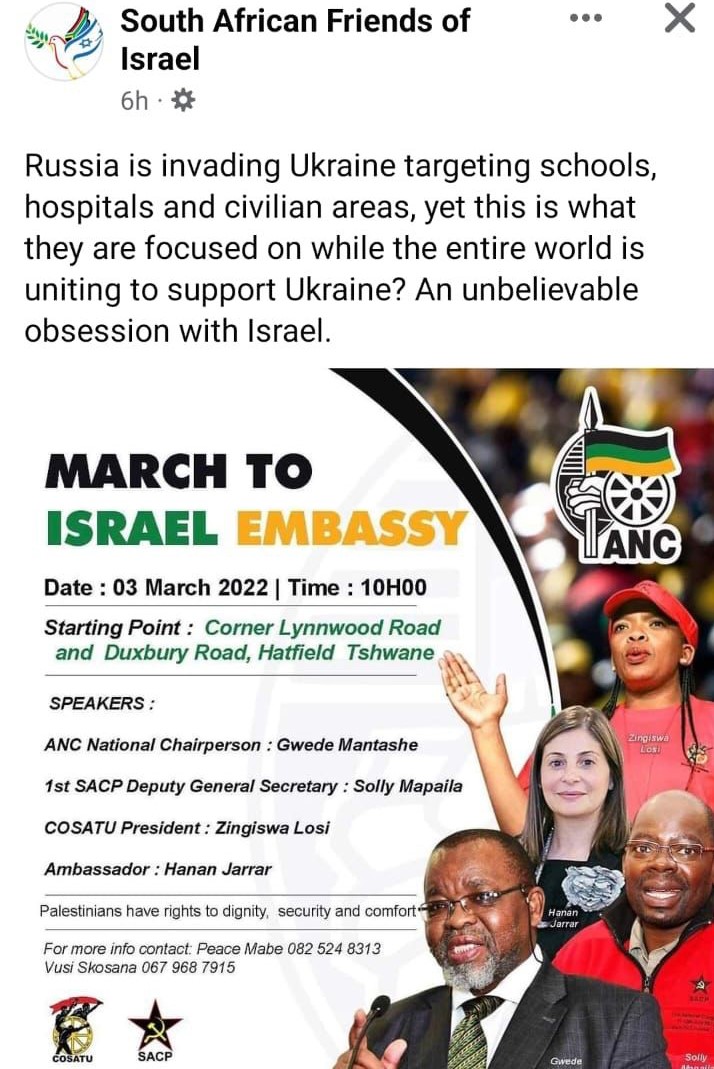 Rowan Polovin, the national chairperson of the South African Zionist Federation said, “Amidst Russia’s invasion of Ukraine and widespread international condemnation, the ANC and its coalition partners have chosen to march not to the Russian but the Israeli embassy. This move, which places the ruling party at odds with the entire democratic world alongside the values espoused in our Constitution, only highlights the ANC’s double-standards and hypocritical obsession with Israel.”