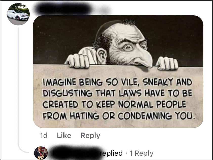 “Imagine being so vile, sneaky, and disgusting that laws have to be created to keep normal people from hating or condemning you,” posted one Facebook user in the comments section of a GOTG post in early November, along with an image of an evil-looking Jew with a kippah and a long nose. The same user posted another comment with a graphic of an Israeli flag being burned, saying that Jews are “the synagogue of Satan”.