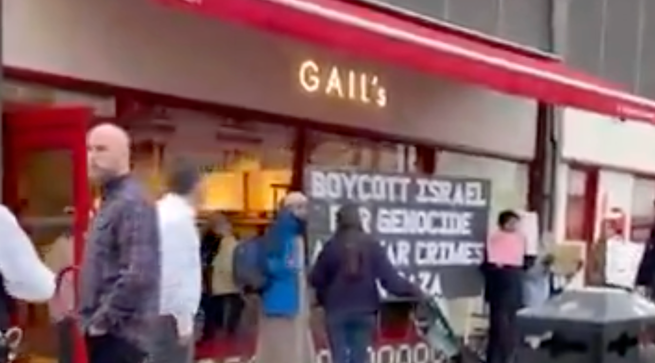 Gail’s Bakery, which operates roughly 170 locations throughout the United Kingdom, opened its new location in north London where it was met by a small group of protesters holding a large sign reading “Boycott Israel For Genocide And War Crimes in Gaza”. Another sign claimed that the bakery was “funded by investors in apartheid”, according to a video of the protest posted online.