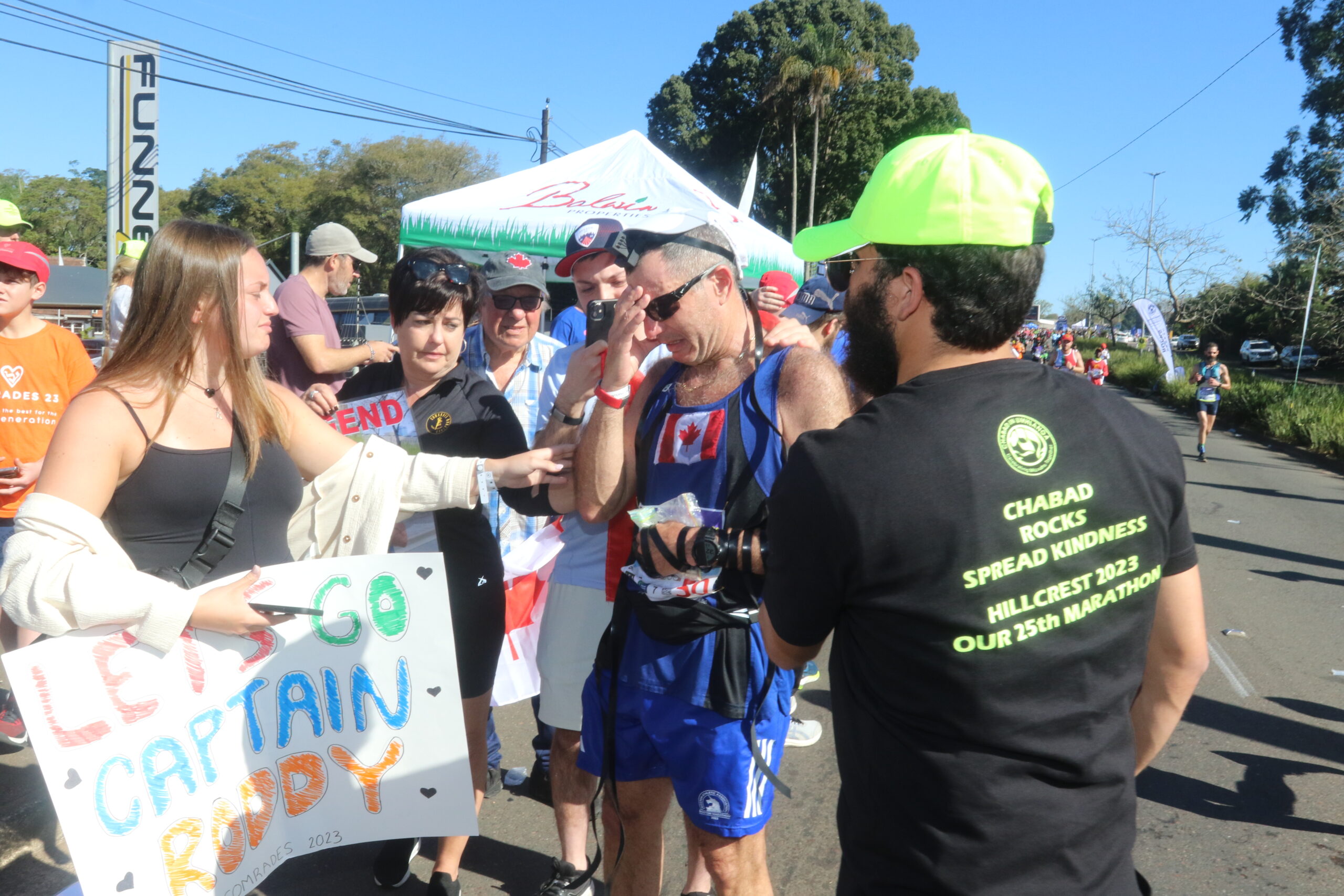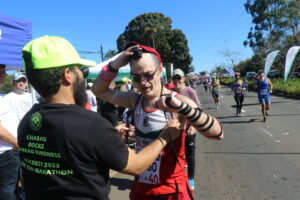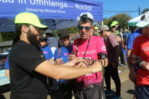 At the Chabad pitstop, male runners get more than just a tefillin opportunity, they have a chance to give tzedakah and get a motivational and strength-inducing hug from the rabbi before they continue on their way to complete the last 30km of the gruelling run before the dreaded cut-off time.