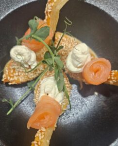 Lay the puff pastry out on a floured surface. Using a dessert spoon and a sharp paring knife cut out the spoon shapes – the spoon is the stencil. Place them on a lightly floured baking sheet. Brush with beaten egg, and sprinkle with sesame seeds. Bake in a 180-degree oven until puffed and golden. When ready to serve, garnish with a cream cheese top with a small smoked salmon rose and a pea shoot.